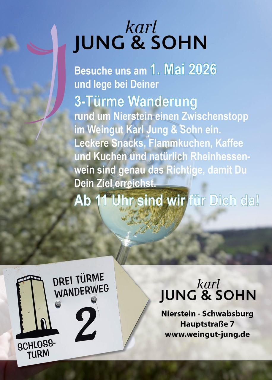 Das Weingut Karl Jung & Sohn öffnet an diesem Tag das den Innenhof für Sie - eine gute Möglichkeit für eine Pause während der 3-Türme-Wanderung. Sie dürfen sich auf leckere Snacks, Flammkuchen, Kaffee und Kuchen und Rheinhessenwein freuen.