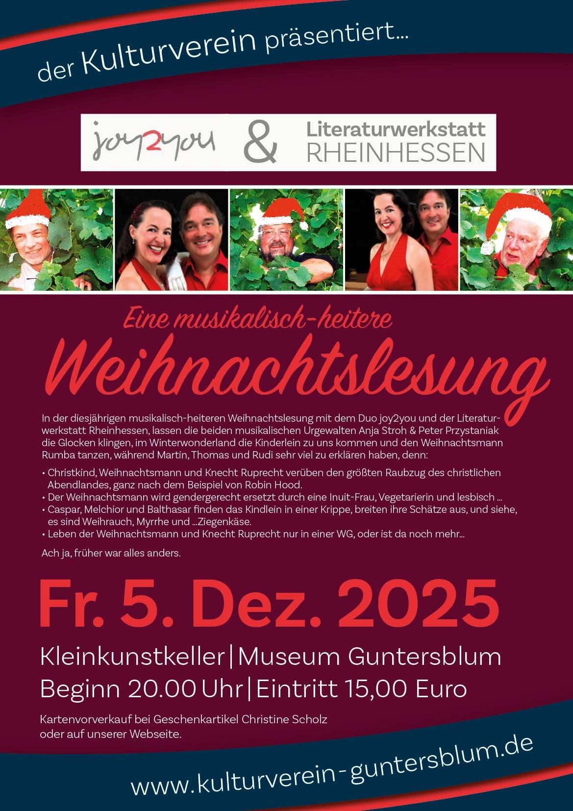 In der diesjährigen musikalisch-heiteren Weihnachtslesung mit dem Duo joy2you und der Literaturwerkstatt Rheinhessen, lassen die beiden musikalischen Urgewalten Anja Stroh & Peter Przystaniak die Glocken klingen, im Winterwonderland die Kinderlein zu uns kommen und den Weihnachtsmann Rumba tanzen, während Martin, Thomas und Rudi sehr viel zu erklären haben, denn: