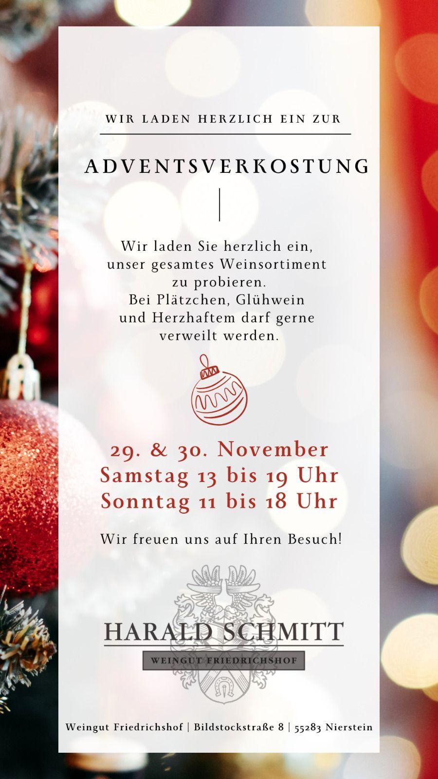 Wir laden Sie herzlich ein, unser gesamtes Weinsortiment zu probieren. Bei Plätzchen, Glühwein und Herzhaftem darf gerne verweilt werden.